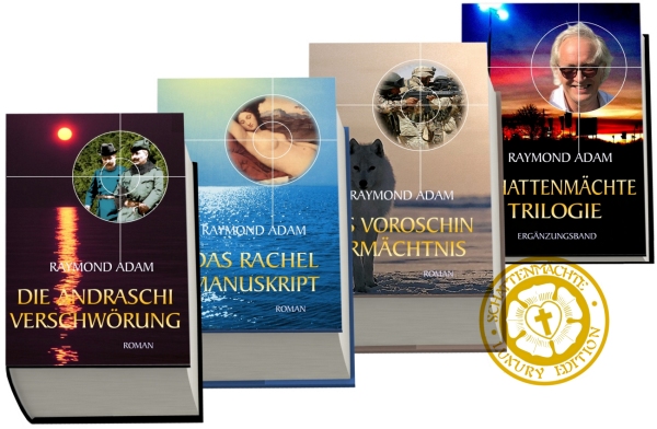 Ray Adams Epos Die Schattenmächte-Trilogie, bestehend aus den Romanen Die Andraschi Verschwörung, Das Rachel Manuskript und Das Voroschin Vermächtnis, ist bis Ostern 2026 nicht im Buchhandel und Onlinehandel erhältlich, weil alle drei Romane zur Zeit sehr aufwändig überarbeitet und umfassend ergänzt werden. Es lohnt sich, auf die Neuauflage zu warten, denn die Überarbeitung des gesamten Textes enthält viele neue Textteile, einige neue Kapitel, mehrere Erzählungen sowie nie zuvor gezeigte Layouts, Farbfotos und Grafiken. Das gesamte Überarbeitungspaket verwandelt die Gesamtausgabe der epischen Trilogie zur begehrten Luxury-Edition - plus dem neuen Ergänzungsband, der auf 100 Seiten viele Farbfotos und Karten enthält, die alle in Zusammenhang mit der Romanhandlung der Trilogie stehen.-
