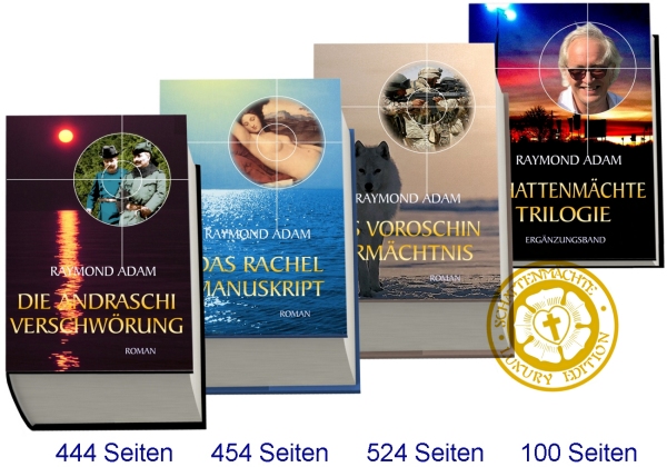 Neu aufgelegt ist der vierte Band der Trilogie - der so genannte Ergänzungsband. Dieses Buch besteht aus 100 Seiten Foto-Hochglanzpapier. Es enhält allein 70 Farbfotografien von Persönlichkeiten der Zeitgeschichte sowie viele Fotos von Ortschaften, Gebäuden und Fahrzeugen, die in den Schattenmächte-Romanen eine Rolle spielen. Die meisten Fotografien habe ich selbst mit hohem Zeitaufwand und großer Sorgfalt digital coloriert. Lediglich sechs Schwarzweißfotos mussten bleiben, wie sie sind, weil sie Personen aus der Zeit des 3. Reichs abbilden. Meine kostbare Zeit für die Colorierung dieses kriminellen Verbrecherpacks zu verschwenden, war mir schlicht und einfach zu schade. - Der Ergänzungsband enthält außerdem 7 farbige, doppelseitig gedruckte Landkarten und Skizzen sowie 9 genealogische Stammtafeln der wesentlichen Familien, die im Schattenmächte-Epos eine Rolle spielen.